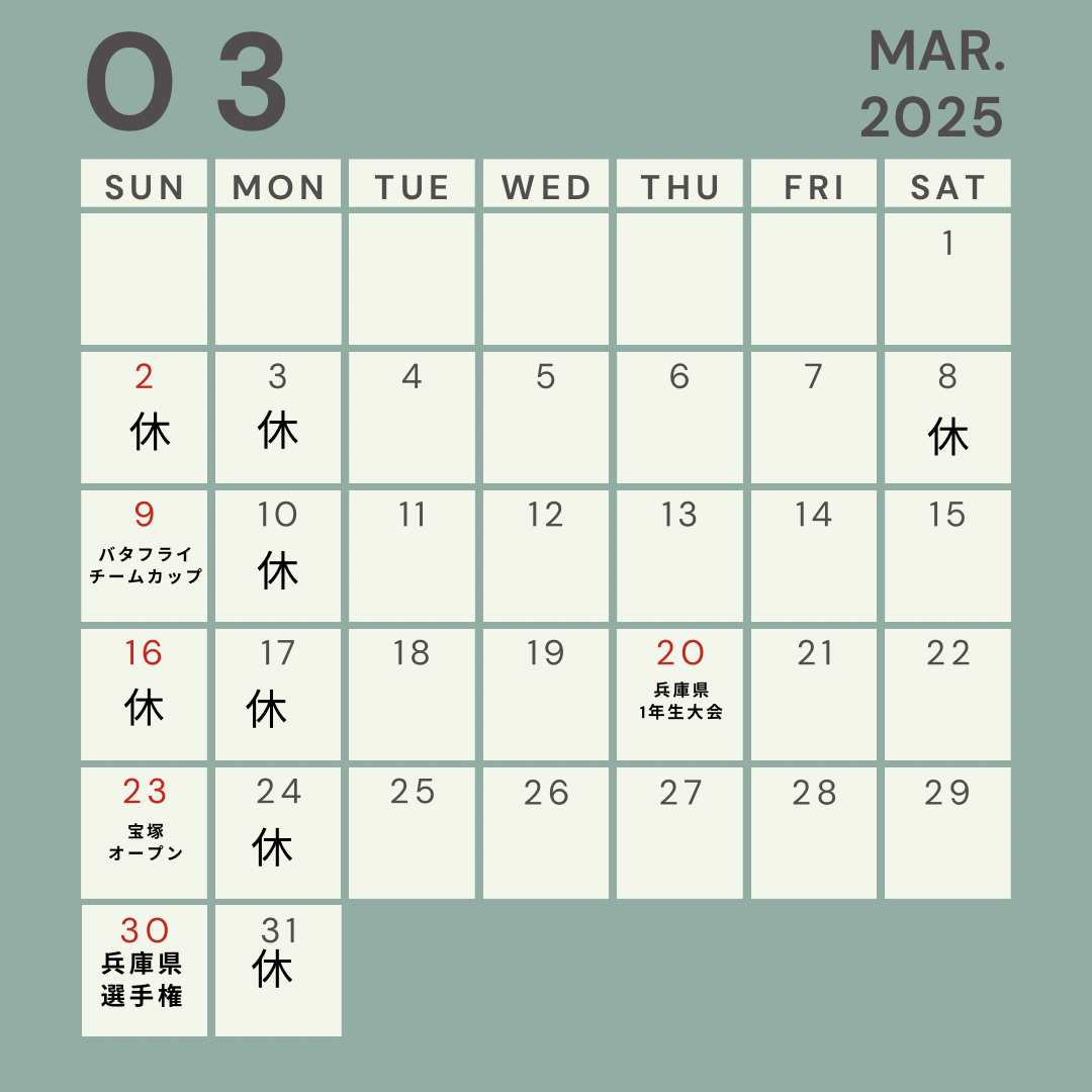 未分類 3月スケジュール 未分類 2025.03.02 気付けばもう3月になってしまいました。笑3月のスケジュールです!空白は《火・水・金・土》通常レッスン《木》PON卓練習会になります。3月20日(木)も練習会あります♪初心者コース《火・水・金》16時半~アスリートコース《火・水・金》17時半~《土》14時~平日限定!無料体験してます!!ご予約はこちらから⇓⇓ LINEで簡単予約 体験予約はこちら