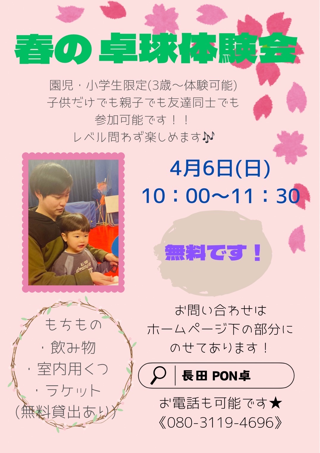 未分類 春の無料体験会 未分類 2025.03.02 春の無料体験会します。園児~小学生対象!子供だけでも親子でも友達同士でも参加可能☆約1年半後、神戸市の中学が部活から新しい形に変わります。何かスポーツさせたいなと思ってる方少し先に卓球してみませんか?ぜひ、ご予約お待ちしております。 体験予約はこちらから
