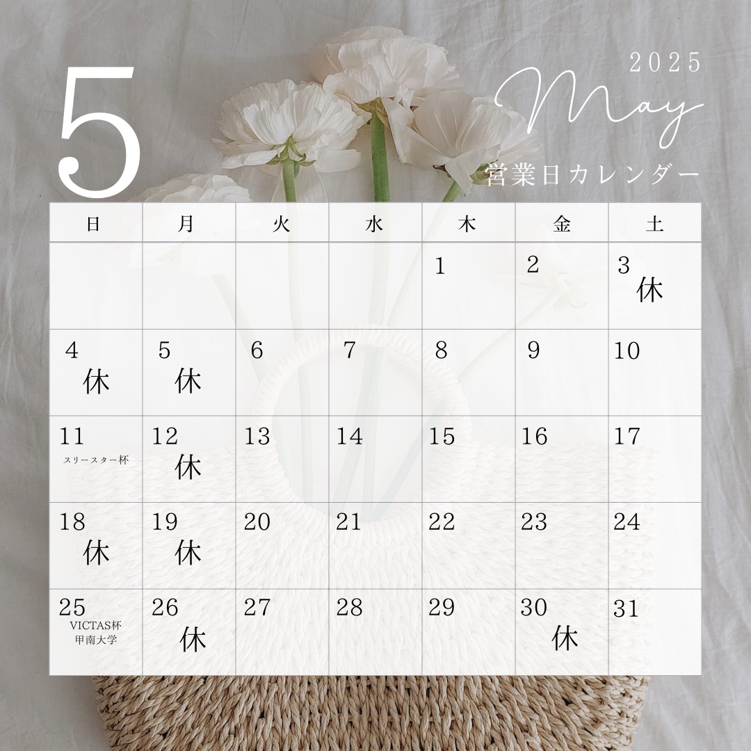 お知らせ 5月予定表 お知らせ 2025.04.27 5月の予定表です!空白の《火・水・金・土》通常レッスン《木》PON卓練習会になります☆初心者コース《火・水・金》16時半~アスリートコース《火・水・金》17時半~《土》14時~無料体験してます♬ぜひご予約お待ちしております!